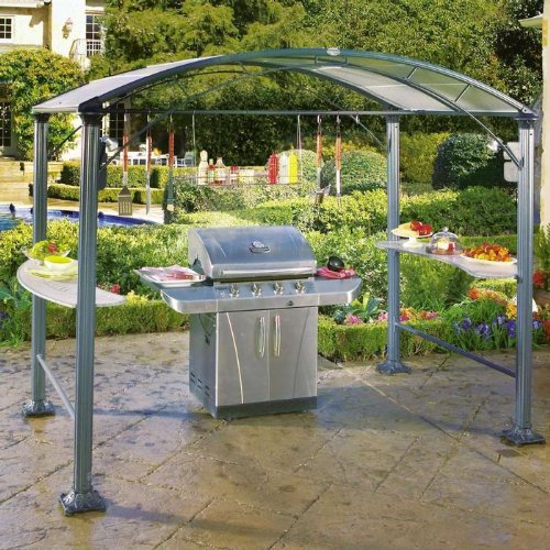 Grillzebo. Grillzebo--a year round outdoor kitchen for the master chef. All you add is the grill. You can grill in the rain and in all four seasons. Overhead, a protective metal roof shelters you from the elements. Inside the Grillzebo are side tables and a condiment/BBQ tool rack to keep everything you need within easy reach. It's even equipped with two rechargeable, bright LED lights (batteries and charger included). Sturdy aluminum frame with fiberstone side tables. Assembly required. 8' 7" w x 5' l x 7' 7" tall. Height of the side tables is 40 inches. A place for everything Grillzebo features: Shelves to hold your grilling items and provide food prep area Racks for spices and condiments Hanging space for grill tools Day or night, rain or shine--keep the grilling going with Grillzebo. Order yours from Brookstone today.